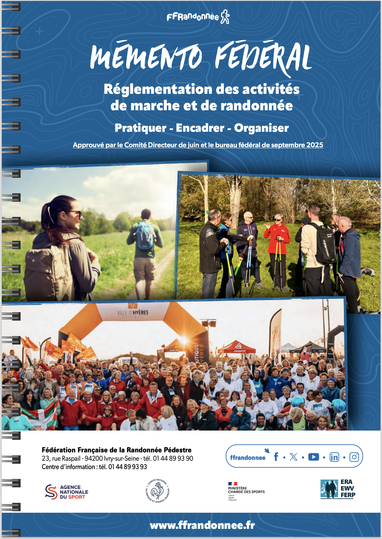 Le nouveau mémento réglementant les activités de marche et de randonnée de la Fédération vient de paraitre. N'hésitez pas à le consulter. Vous pouvez le télécharger ici.